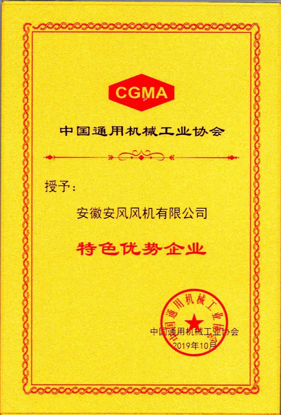 2019年10月中国通用机械工业协会授予:安徽安风风机有限公司——特色优势企业