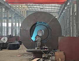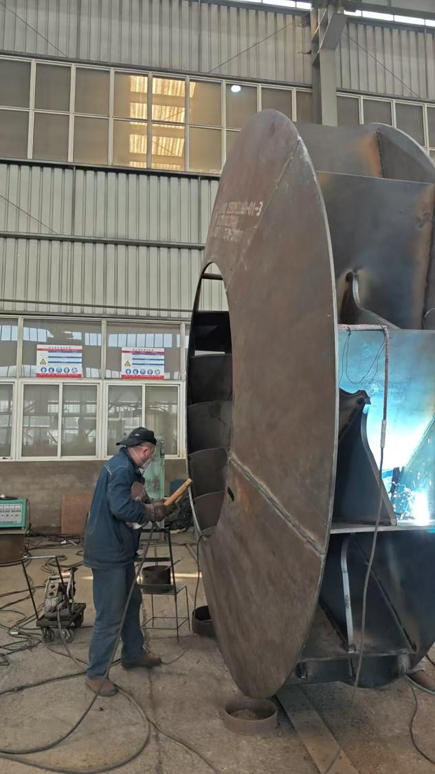 走进安风公司叶轮车间,耀眼的弧光如银色闪电般此起彼伏,在“嗞嗞”的焊接声中,直径达3.7米的双吸双支撑离心风机核心部件:巨型叶轮,正在经历最关键的一道工序:整体组对焊接。