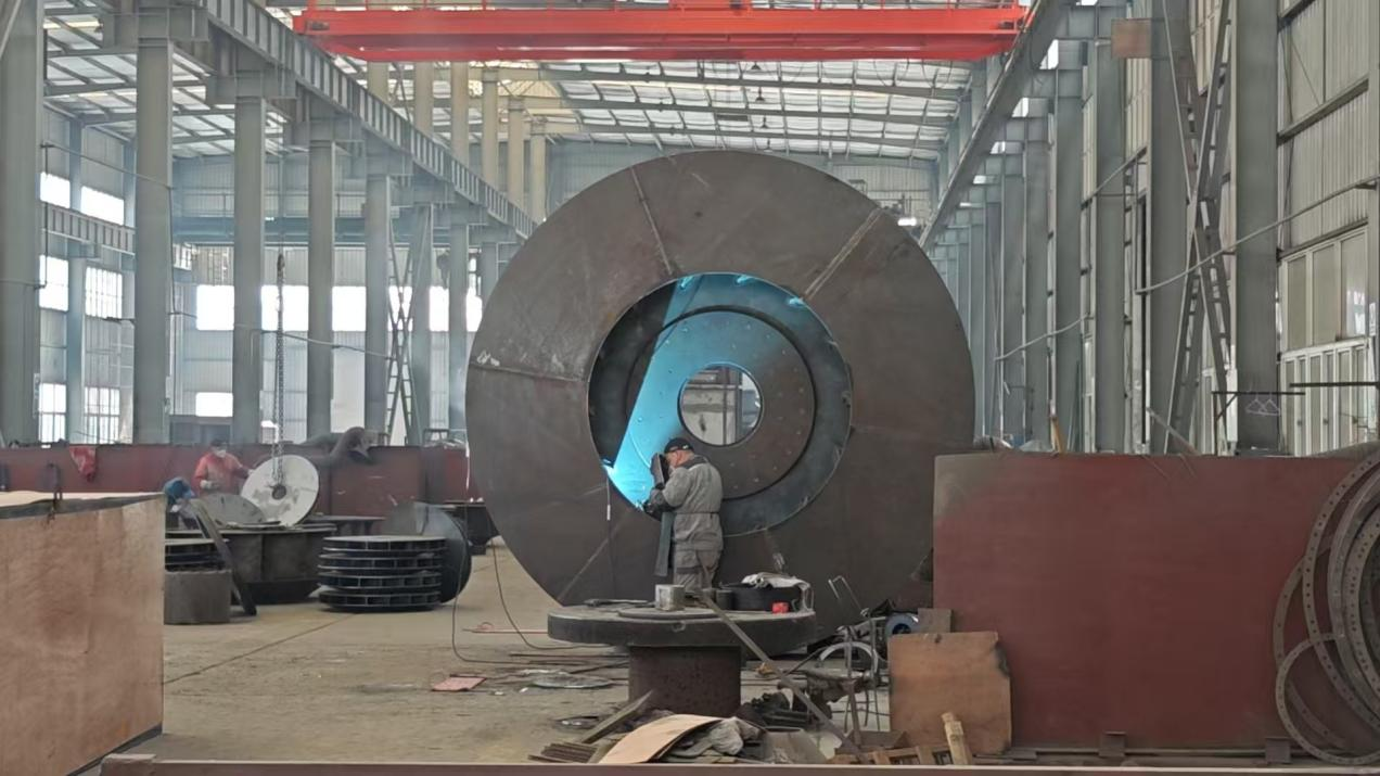 在近一层楼高的叶轮旁,高级焊工们正手持焊枪,全神贯注地进行着精密焊接。由于叶轮直径达3.7米,未来将配套功率达4300千瓦的高压电机高速旋转使用,承受着巨大的离心力,因此每一条焊缝都必须做到“天衣无缝”。焊工们需钻进狭小的叶片间隙,以各种别扭的姿势长时间作业,确保熔池深度均匀,杜绝任何气孔与夹渣。